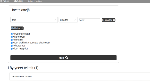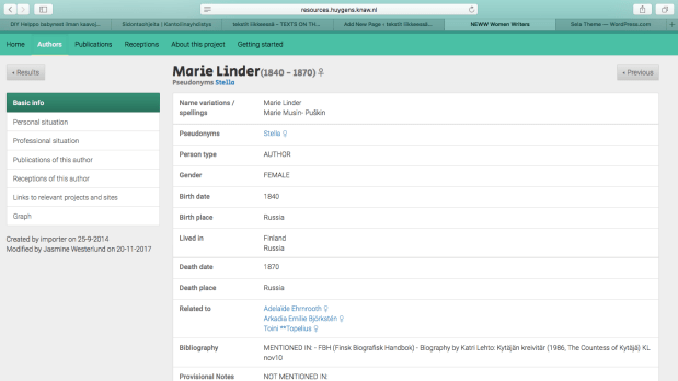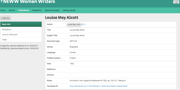 Техническая оболочка базы данных была разработана и создана выпускником кафедры русского перевода университета Тампере, доктором философии Юхой Хярме. Я начала свою работу в проекте с ввода данных о восприятии литературного творчества финских и русских писательниц в 1980-2000, 1880-1939 годы.