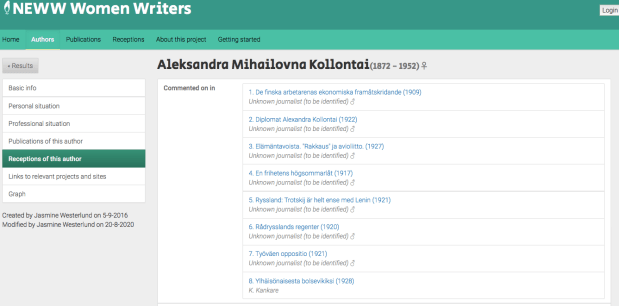 Tutustuin ensimmäistä kertaa vuonna Women Writers -tietokantaan 10 vuotta sitten, syksyllä 2010. Tuolloin Haagissa pidettiin työpaja, jossa kymmenisen akateemista naista opetteli tietokantatyöskentelyn saloja Women Writers Networks -nimikkeellä. Huygens -instituutin alla ja Suzan van Dijkin johdossa toimivassa projektissa pyrittiin ei sen vähempään kuin saamaan naiskirjallisuuden historia ja erityisesti naisten väliset verkostot tietokantaan kaikkien näkyville ja käytettäviksi. Kokoushuone oli hämyinen mutta tunnelma innostunut, kun näpyttelimme tunti toisensa jälkeen tietokantaan naiskirjailijoiden tietoja, heidän teoksiaan ja teosten reseptioita. Tietokanta löytyy edelleen osoitteesta http://neww.huygens.knaw.nl